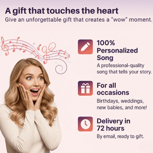 Transformez votre histoire en une magnifique chanson originale, créée spécialement pour vous par une IA. Partagez vos émotions, vos souvenirs ou vos moments précieux, et recevez une chanson personnalisée de qualité professionnelle sous 24 à 48 heures.